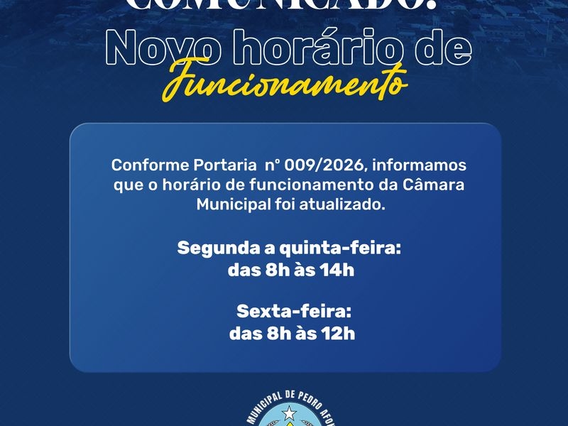 A mesa diretora da Câmara Municipal informou, por meio de comunicado oficial, a atualização nos horários de funcionamento da casa legislativa. A partir da vigência da nova portaria, o expediente ocorrerá de segunda a quinta-feira, das 8h às 14h, e nas sextas-feiras, das 8h às 12h. A medida busca otimizar os processos internos e padronizar o acesso da população aos serviços do Poder Legislativo.