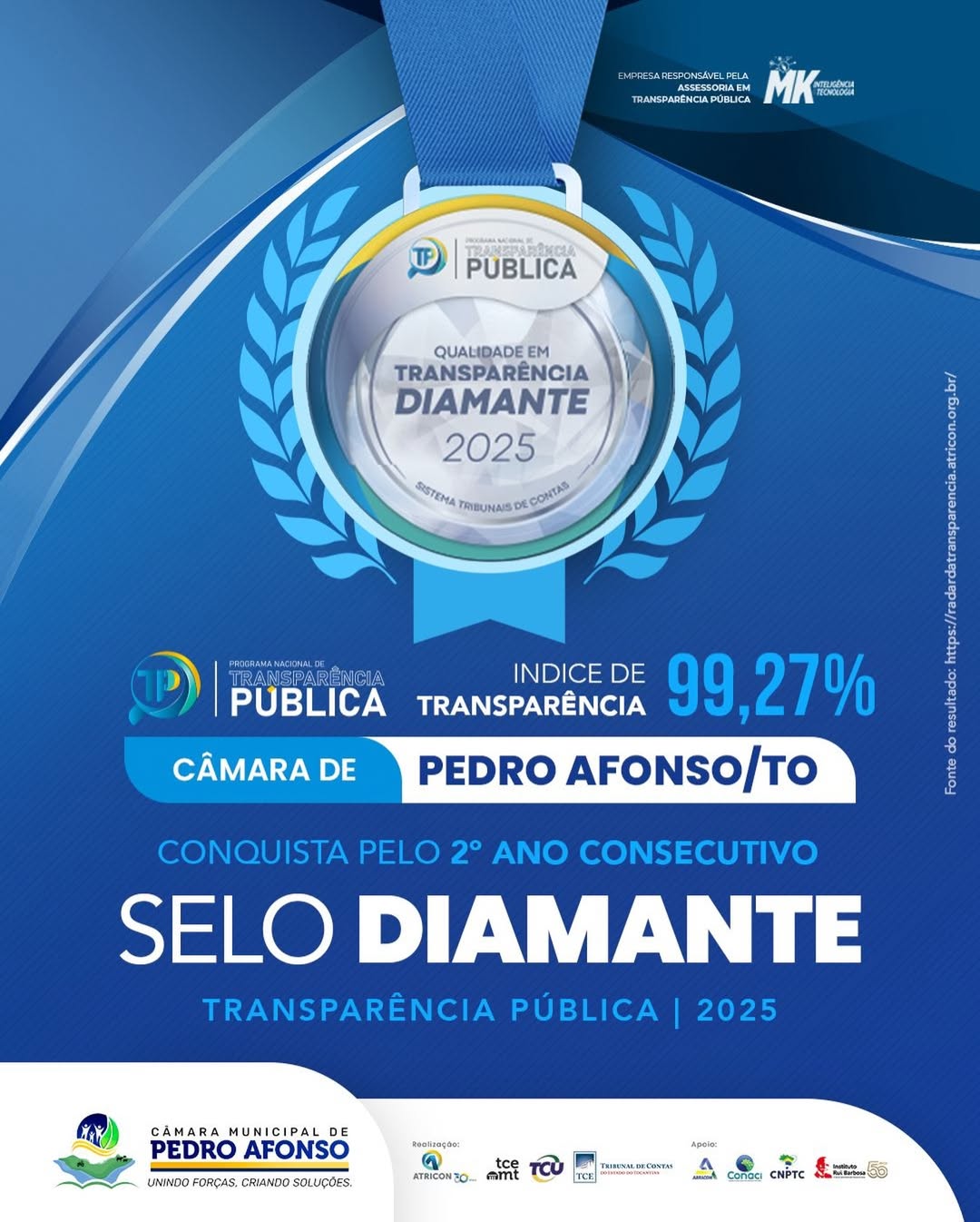 A Câmara Municipal de Divinópolis do Tocantins conquistou, pelo terceiro ano consecutivo, o Selo Diamante do Programa Nacional de Transparência Pública. Este feito notável e contínuo reafirma o compromisso permanente da Casa Legislativa em manter um padrão elevado de responsabilidade pública, garantindo que todas as informações sejam acessíveis, atualizadas e organizadas para toda a população.